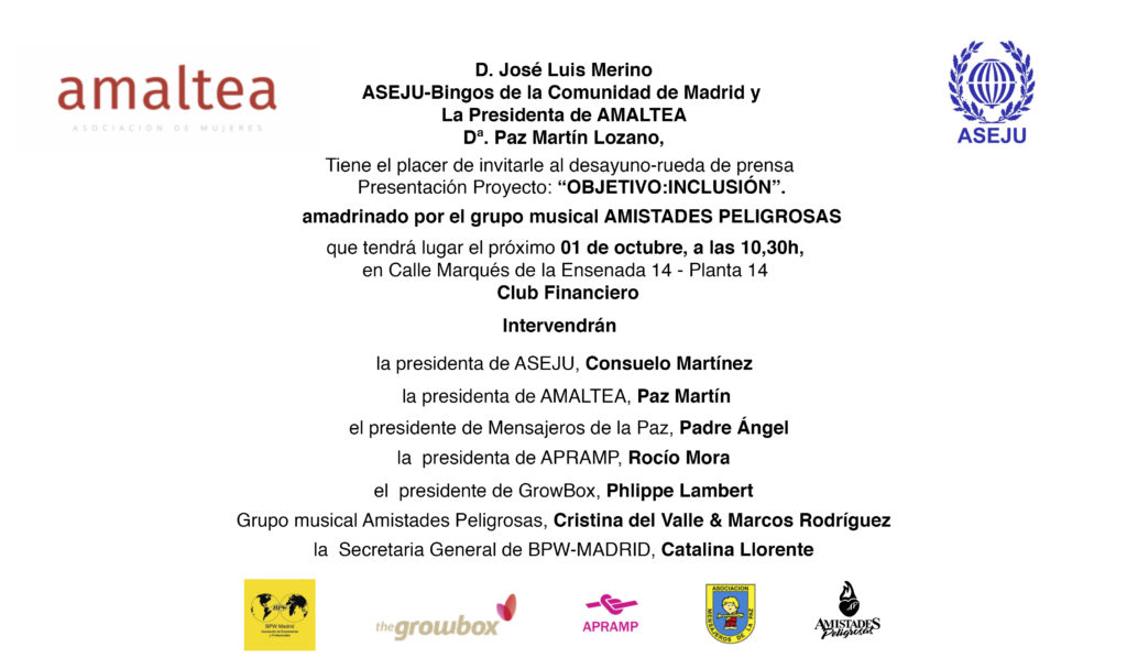 El próximo lunes 1 de octubre a las 10:30 horas se presentará en el Club Financiero Génova en Madrid el proyecto “Objetivo: inclusión” dirigido a mujeres víctimas de trata de APRAMP (Asociación para la Prevención, Reinserción y Atención a la Mujer Prostituida) y mujeres en riesgo de exclusión pertenecientes a la Asociación Mensajeros de la Paz. El proyecto está patrocinado por ASEJU-Bingos de la Comunidad de Madrid y lo pondrá en marcha la Asociación de Mujeres Amaltea junto a BPW-Madrid (Asociación de Mujeres Empresarias y Profesionales). Este proyecto está amadrinado por el grupo musical Amistades Peligrosas.